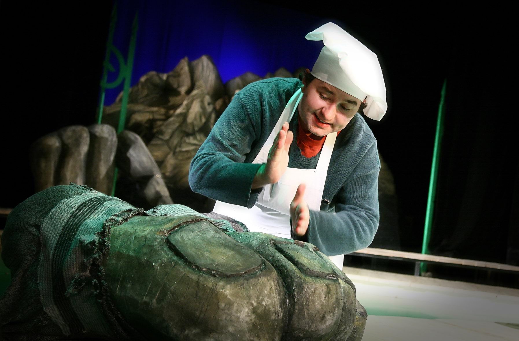 Pełna humoru opowieść o naiwnym piekarczyku Matołuszu, który dzięki dobremu sercu i sprytnemu usposobieniu wybawia z kłopotów Króla, jego córkę i mieszkańców zamku. Spokój zakłóca im bowiem pradawny Olbrzym. Jego groźne pomruki kruszą niemal królestwo w posadach. Odważny śmiałek, który udobrucha potwora, otrzyma rękę Królewny, zamek i jajko na śniadanie. W szranki z Olbrzymem chcą stanąć: pyszałkowaty Jędrek i nieśmiały wielbiciel Królewny – Matołusz. W pełnej przygód podróży poznają wiele osobliwych postaci: Ślimaka Natalię, Prastarego Człowieczka, Perliczkę Sheilę i Jeża Nowaka... Spektakl jest autorskim odczytaniem utworu Tankreda Dorsta i Ursuli Ehler. Tekst sztuki jest dla Pawła Aignera pretekstem do wydobycia humoru sytuacyjnego. Reżyser prowokuje aktorów do zabawy słowem i grania formą, a wszystko dopełnia surrealistyczna scenografia. Muzyka buduje nastrój przedstawienia, a partie wokalne postaci przypominają nieco operę buffo.