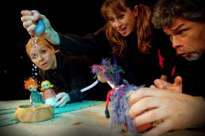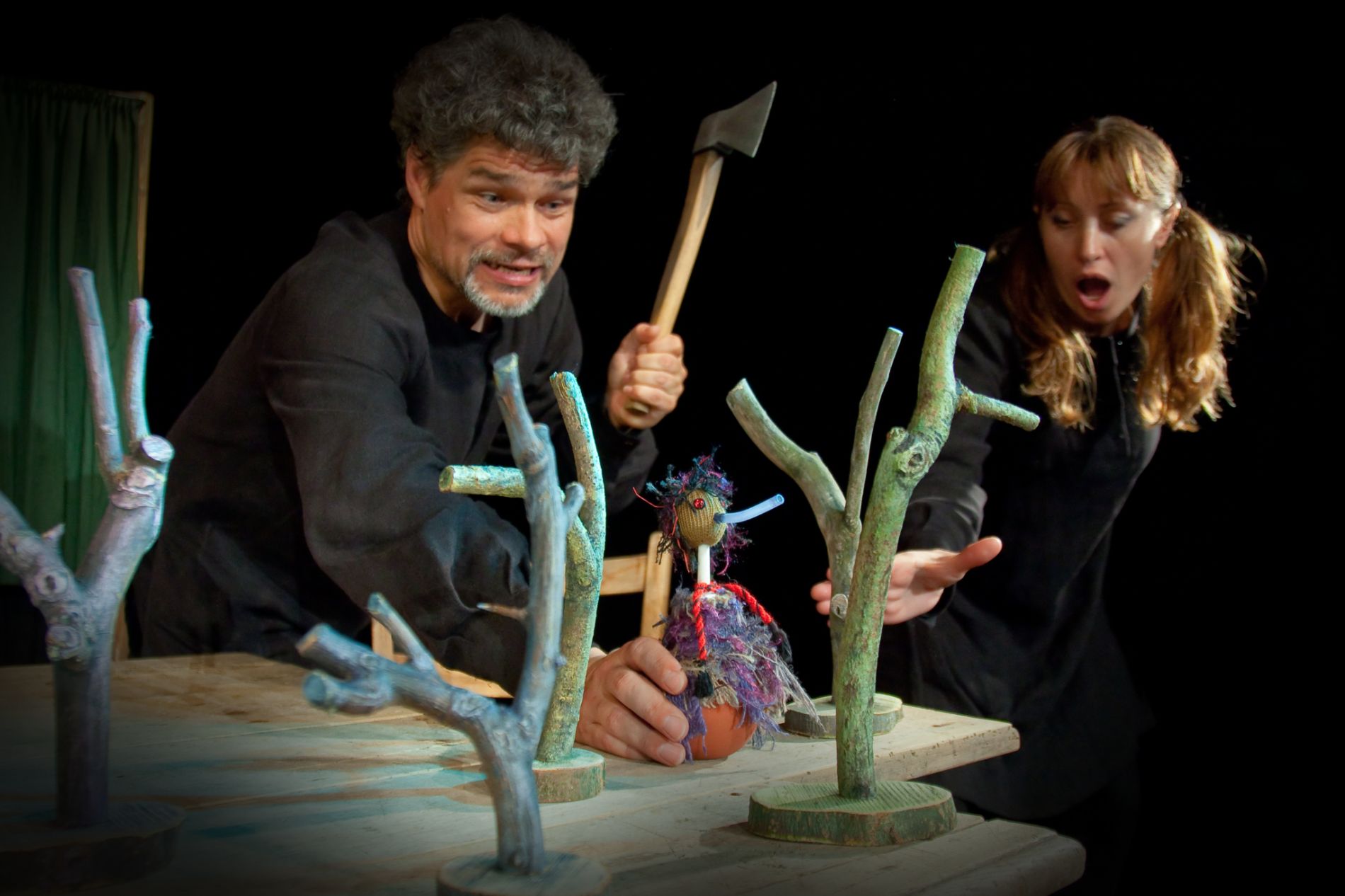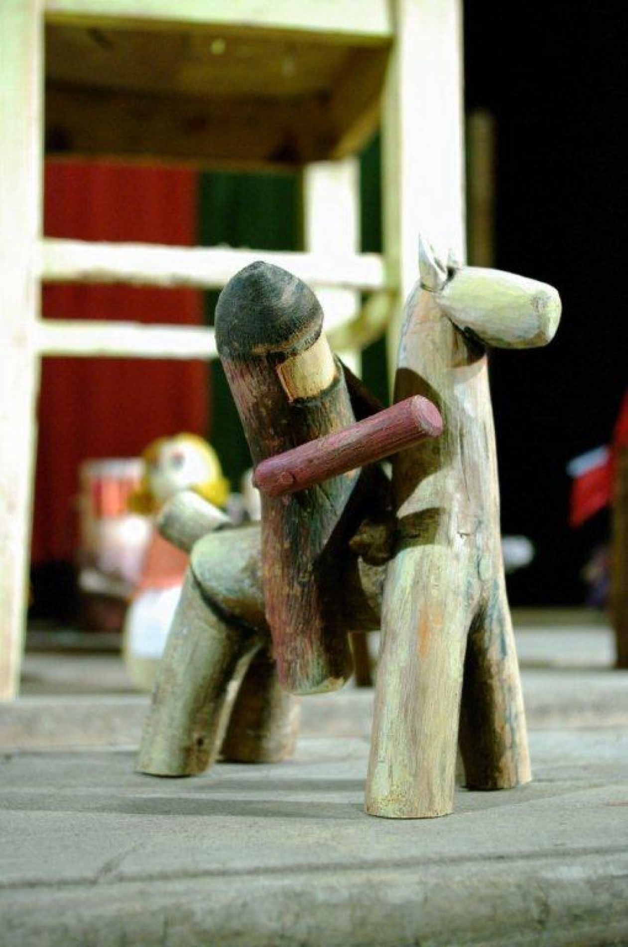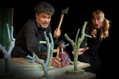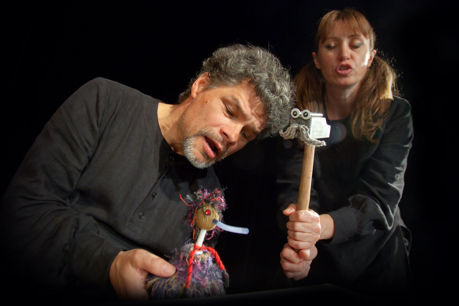 W niewielkiej sali, pełnej małych dzieci, panuje niezwykła cisza. Przestrzeń sceny wypełnia drewniany stół, wokół którego aktorzy siedzą, snują baśń, podnosząc się z krzeseł, by włączyć do akcji lalki – postaci baśniowe. One wprowadzająw statykę obrazu ruch, także zminimalizowany, ale wyrazisty. Aktorzy wykonują najprostsze czynności: dmuchają na łódkę, w której płynie po jeziorze-płaskim naczyniu wypełnionym wodą, rybak Wiewióruszek; wysuwają jedną deskę z blatu stołu tworząc drogę, po której kroczą bohaterowie; delikatnie uruchamiają pojedyncze elementy wykonanych z okorowanych klocków drewnianych postaci rozbójników: rękę jednego, głowę drugiego, usta trzeciego, długi wystający jęzor czwartego, bo każda figura-lalka ma całkiem inne możliwości animacyjne. W tłumie postaci (trzydzieści dwie, choć widzimy sześć) odnajdujemy skomplikowany system ruchów, wszystko żyje i jest zindywidualizowane. Podobnie figurka pustelnika, przystosowana wyłącznie do prymitywnego klękania, ale w rękach dobrego animatora i aktora, tworząca bogaty charakter postaci. W otaczających pustelnika ptakach zagrano ich skalą (są różnej wielkości) i bogactwem dźwięków, wydobywanych najpierw z drobnych instrumentów-gwizdków, którymi posługują się aktorzy, by niespodziewanie i niezauważalnie wejść w nagraną ścieżkę dźwiękową skomponowaną przez Bogdana Szczepańskiego. Aktorzy, którzy przed sekundą tworzyli tę ptasią orkiestrę, po chwili słuchając i obserwując świergoczące i latające ptaki niczym magiczne zdarzenie, są równie zaskoczeni, jak oglądający spektakl widzowie. Czar trwa.
